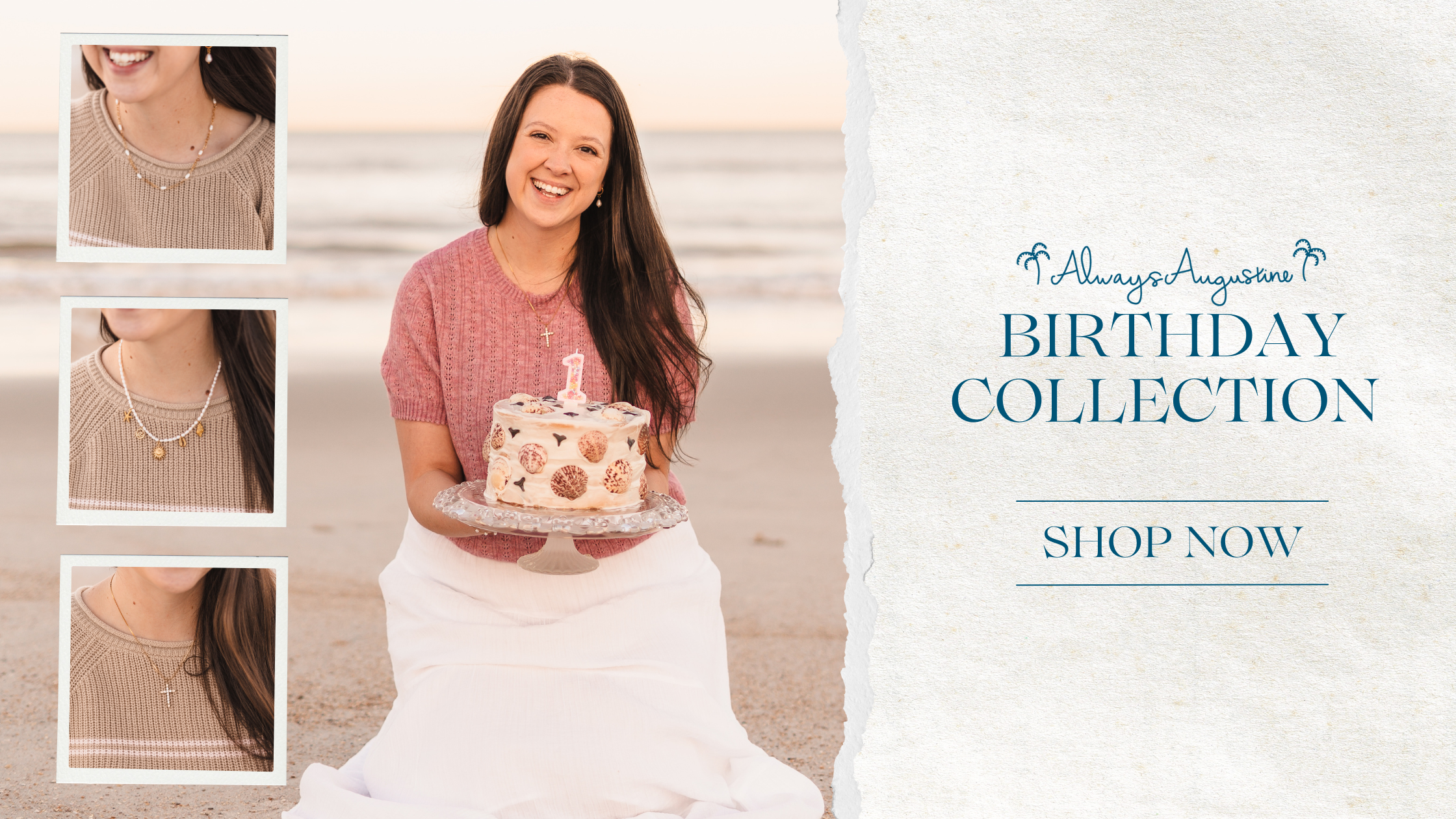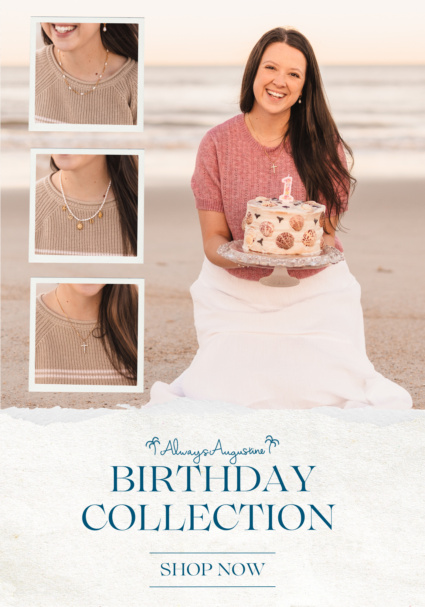 A birthday collection celebrating one year of Always Augustine — featuring handmade pearl designs, meaningful charms, and fully waterproof jewelry made for everyday wear.
