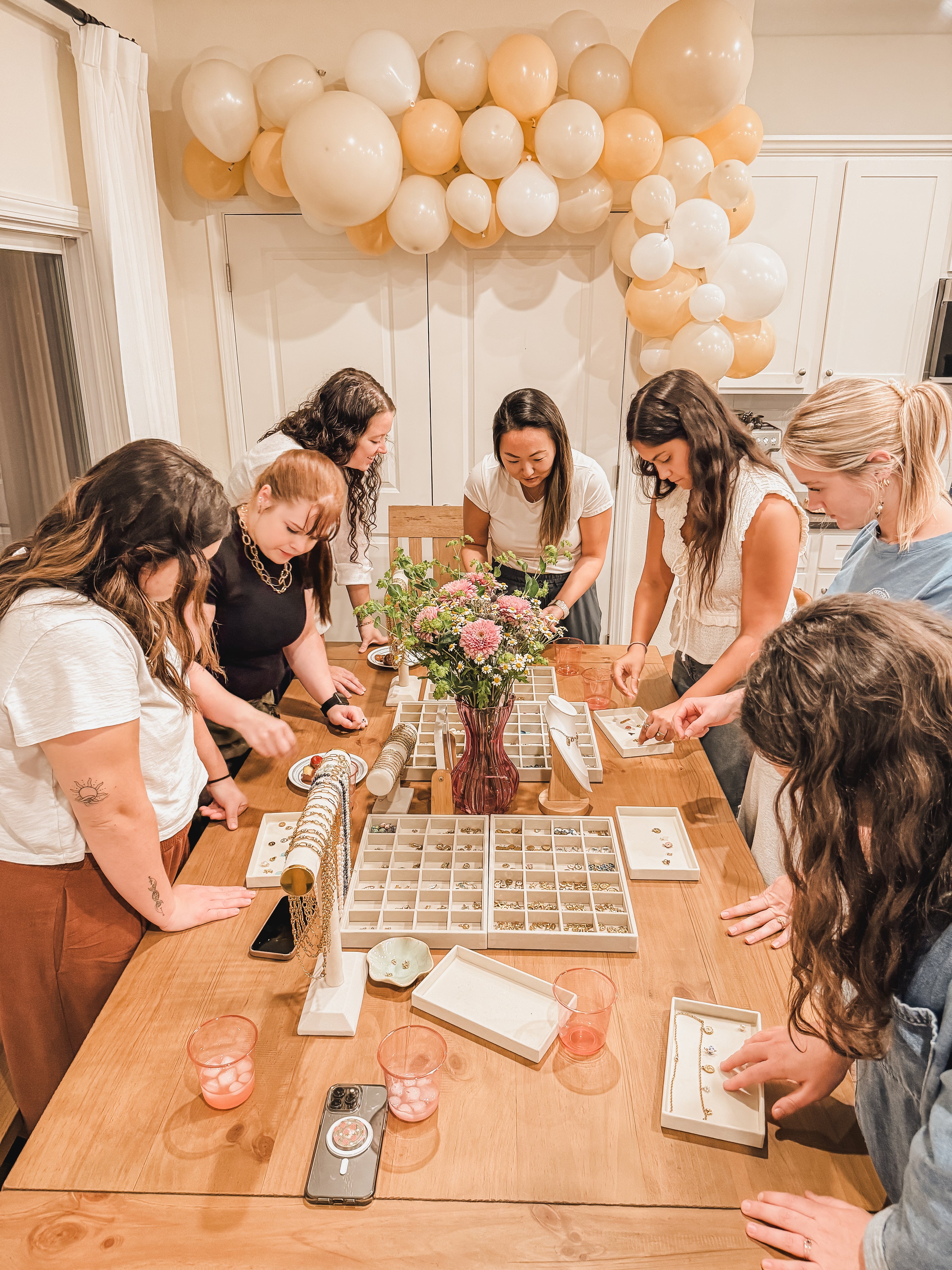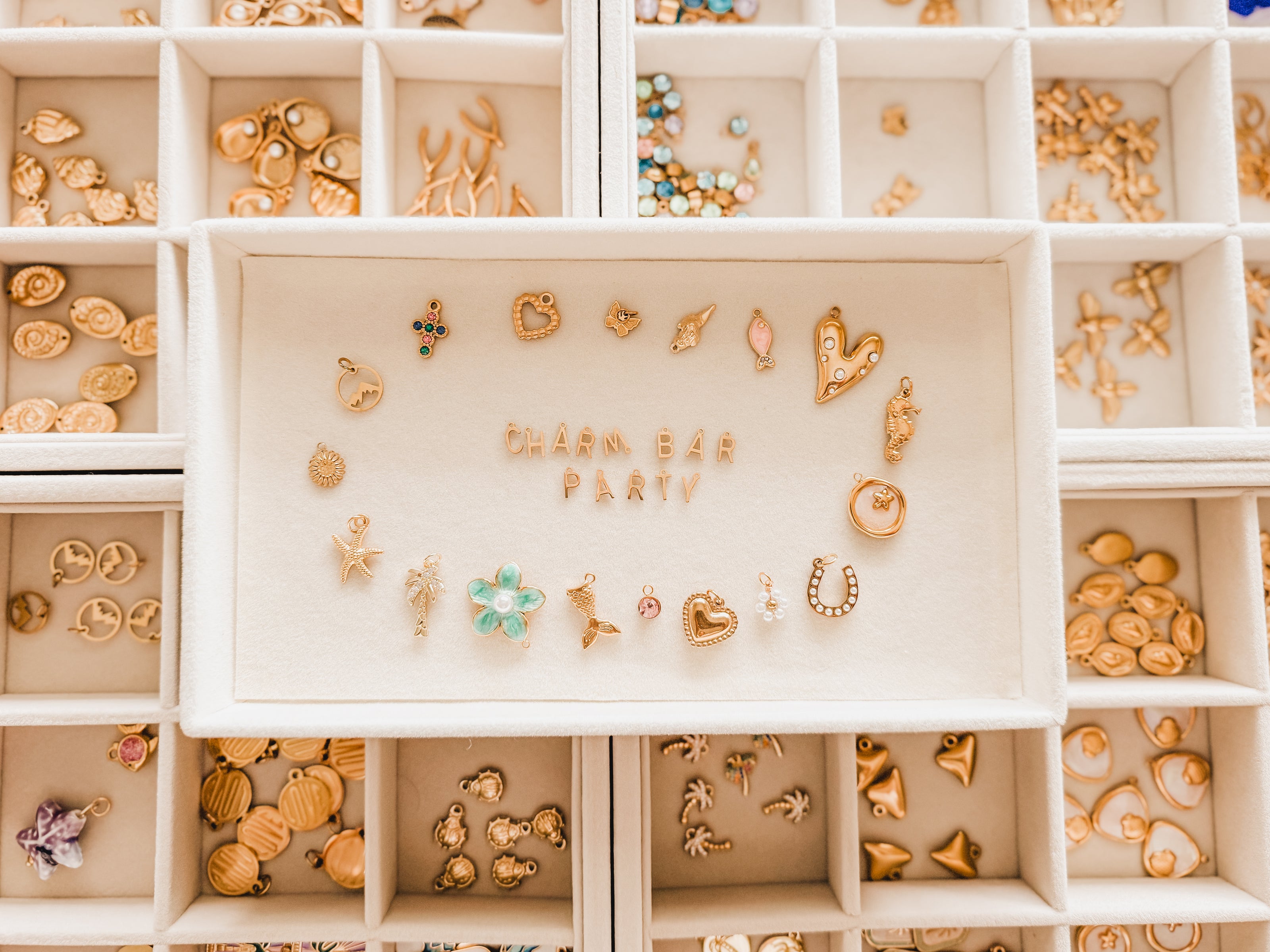 A Charm Bar Party is a create-your-own jewelry experience hosted by Always Augustine. Guests choose their necklace chain and pick their favorite charms to design a piece that feels personal and meaningful. Think of it as jewelry-making, but elevated -- a fun night with your people, pretty packaging, and jewelry you'll actually want to wear every day!