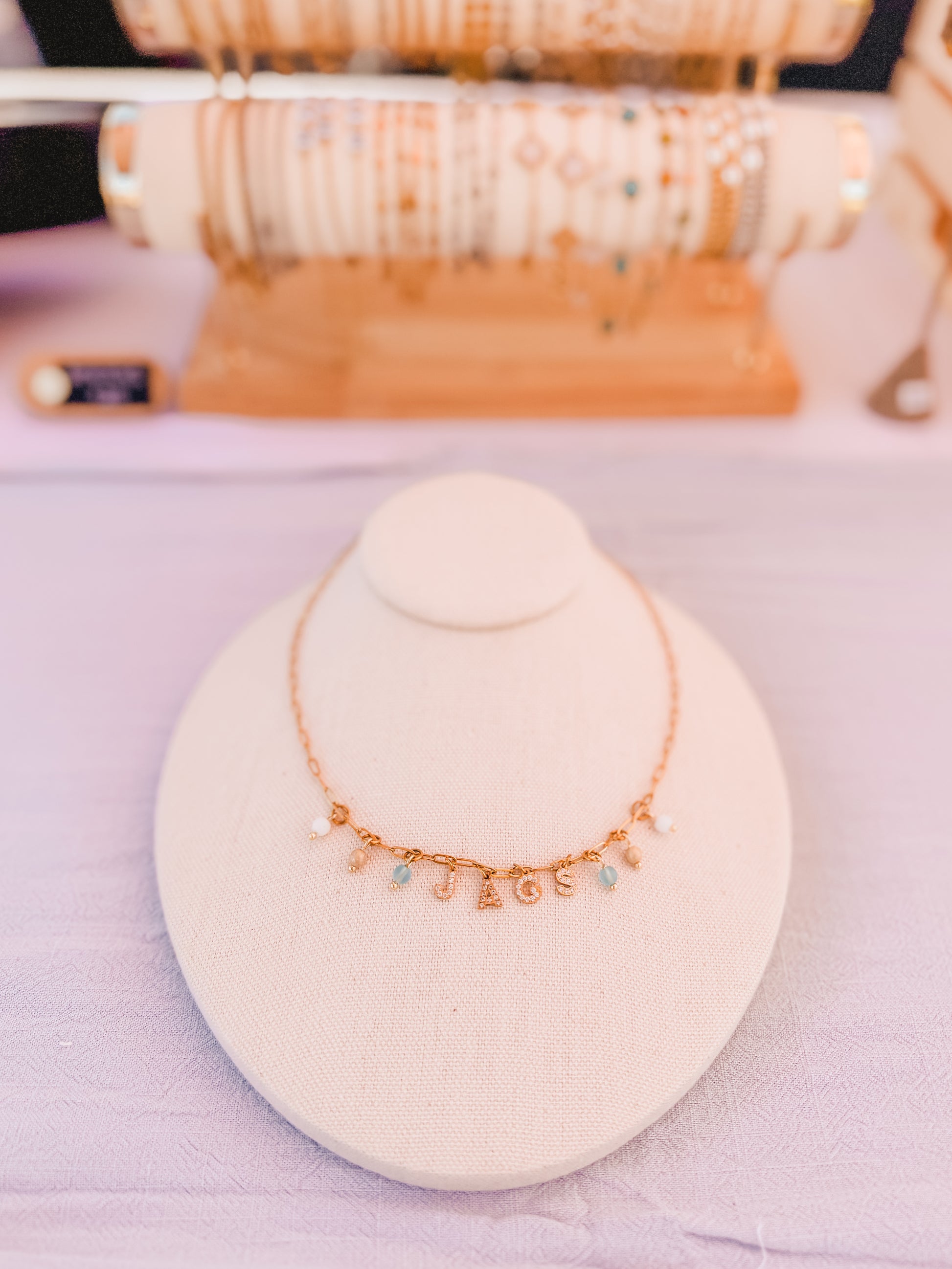 This dainty charm necklace spells out JAGS with gold letters and team-inspired accents β soft aqua drops, petite pearls, and a warm gold chain that keeps the whole look elevated, feminine, and game-day ready.