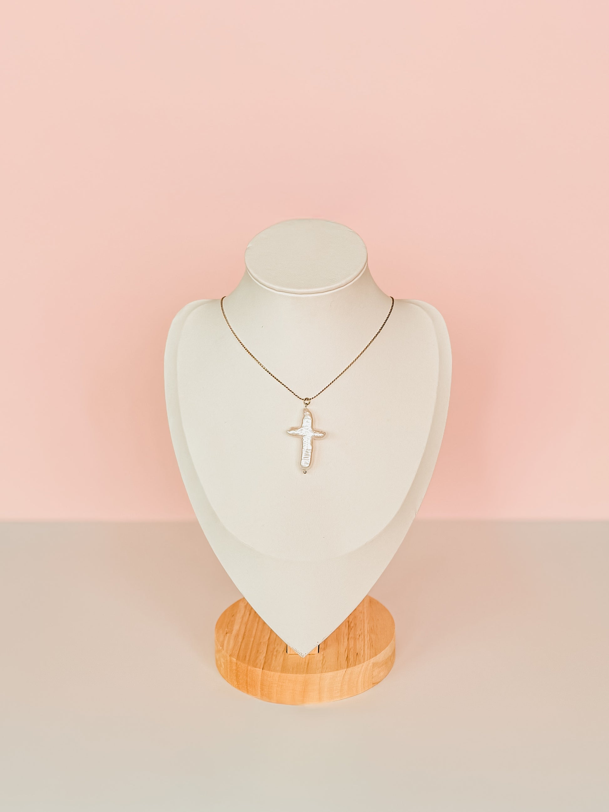 A timeless cross pendant made from freshwater pearl, each one naturally unique in shape and shine.